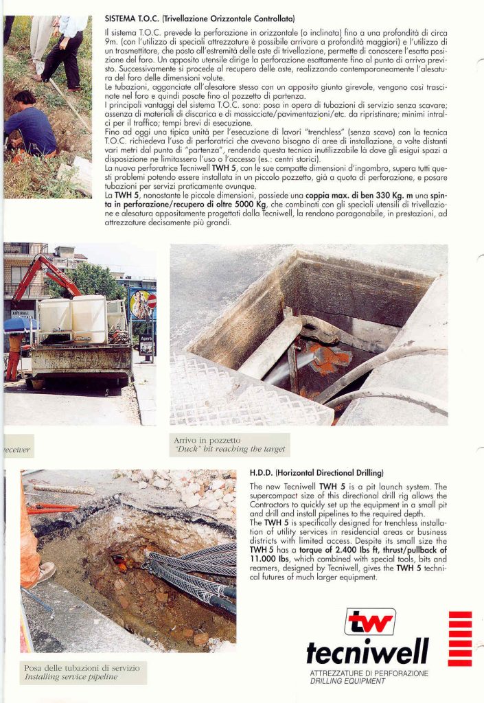 Once back to Italy, Mr Speranza and his associates capitalized on the African experience and became proficient in HDD (Horizontal Directional Drilling). Thus, they won contracts to build backbone fiber-optic telephone lines which were part of Telecom Italia’s ambitious investment program named SOCRATE. SOCRATE seemed the perfect opportunity to work for years, as its aim was to connect 10 million households in the major Italian cities. But unfortunately was cancelled literally overnight in December of 1977, when Telecom Italia realized that their technology (co-axial cables) had already become obsolete. As a result, the companies created for this purpose by Mr. Speranza (ITALETCH and NEOTECH) sank in the financial-legal storm which followed, made worse by un-ethical behavior of some business associates..